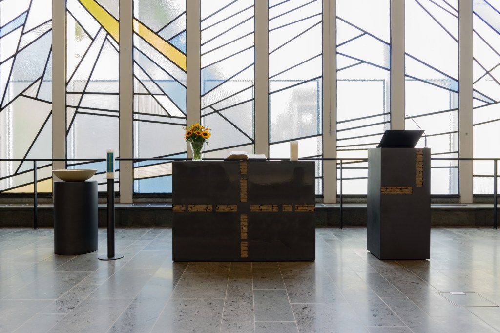 Auch der Gottesdienstraum ist durch die weiße Rückwand und Decke sehr hell gestaltet. Durch das Glaskunstwerk an der Altarseite gelangt viel Licht in Raum, bei Bedarf können Vorhänge zur Hilfe genommen werden. Die Backsteinwände und der dunkle Steinboden bringen dem Raum Ruhe.