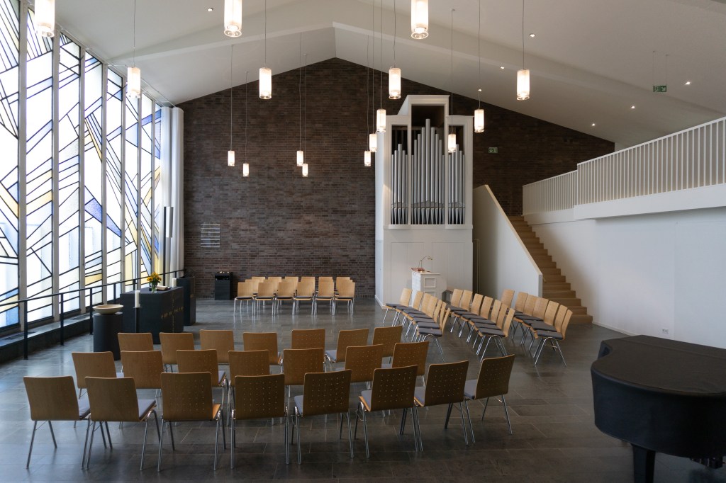 Der Gottesdienstraum wurde behutsam neu geordnet und saniert. Die neuen Prinzipalstücke stehen nun vor der Rückwand, welche von einer riesigen Glasmalerei über die gesamte Länge geprägt wird. Die zwei Seitenwände wurden in Backstein belassen.