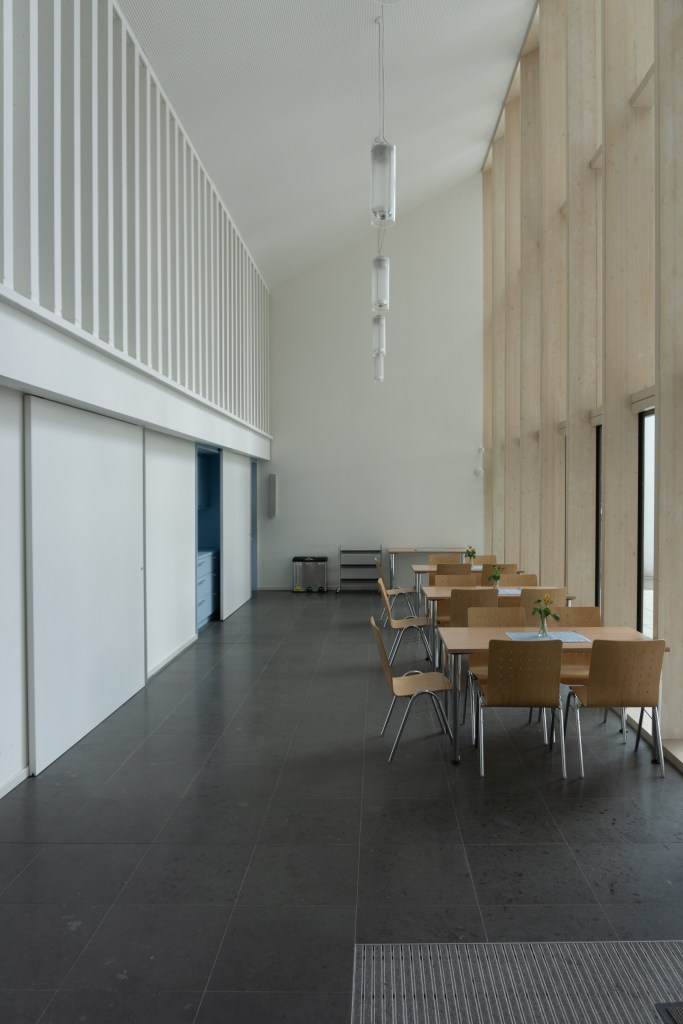 An die bestehende Kirchenfront wurde ein vollverglaster Anbau vorgesetzt, so dass eine Galerie entsteht, in welcher Küche, Garderobe und Sitzmöglichkeiten untergebracht sind. Die Galerie läuft über die gesamte Frontseite und ist mithilfe einer hölzernen Pfosten-Riegel Fassade konstruiert. Dadurch wirkt sie hell und einladend. Durch große Schiebetüren lassen sich eingebaute Küchennischen öffnen, welche komplett hellblau gehalten sind.