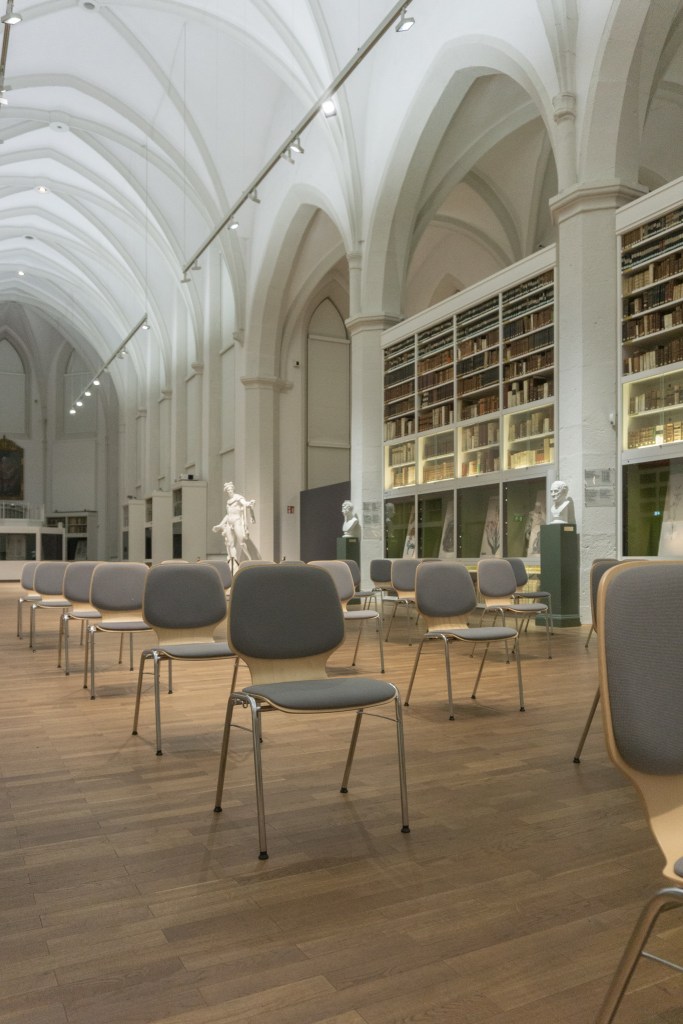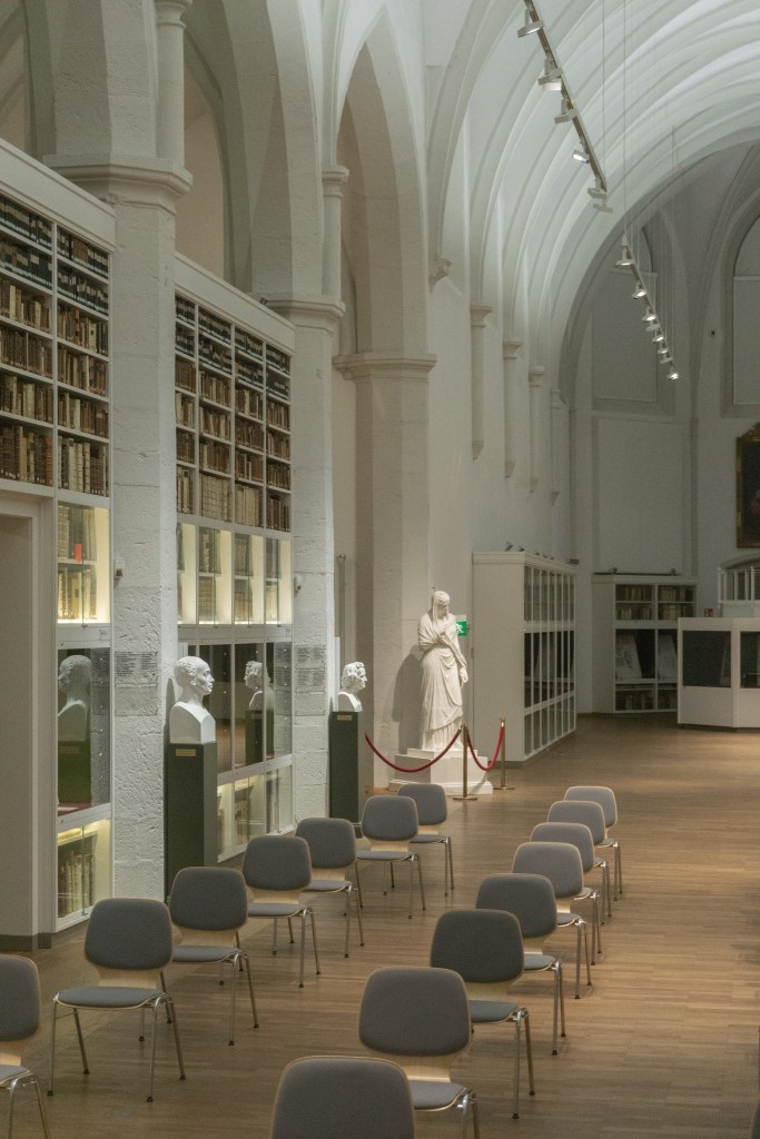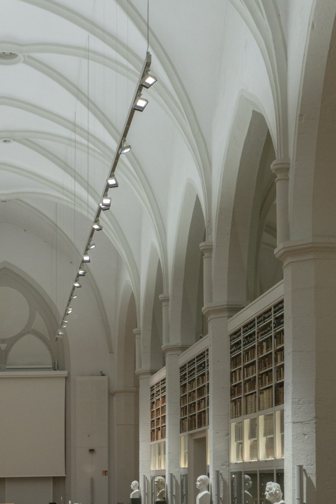 Durch zwei durchgängige Lichtschienen wird der Hallencharakter des Raumes verstärkt. Indirekte Bestrahlung setzt zudem das Kreuzgewölbe in Szene, während Strahler gezielt die Vitrinen, sowie die historischen Büsten berühmter Professoren der Universität beleuchten. Insgesamt entsteht ein ehrfürchtiger Raum, der die ursprüngliche Architektur der Kirche unterstützt und mit den ausgestellten, historisch wertvollen Bücherbeständen der Universität verbindet.